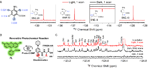 在此基础上,团队经探针骨架筛选与优化,针对胺基类化合物设计合成了Photo-CIDNP响应型高灵敏19F衍生化探针。该探针在单次采样条件下(2秒)即可实现1μM氨基酸混合物的快速检测,信号增强普遍超过100倍;单个氨基酸检测限低至20 nM(64次扫描),并成功应用于细胞裂解液中胺基类化合物的快速检测。顺利获得调控衍生化单元结构,还可实现对特定氨基酸的选择性检测,展现出良好的可拓展性。基于该方法,团队进一步实现了细胞氧化应激过程中氨基酸含量动态变化的快速检测。